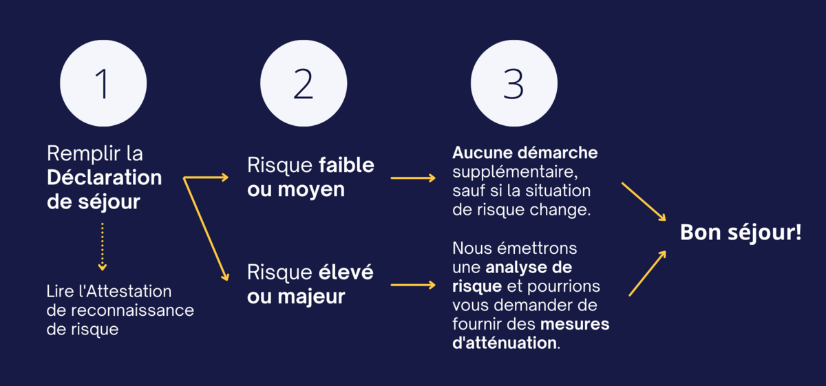 Pour obtenir de l'information sur la Déclaration de séjour, l'évaluation du risque ou recevoir un accompagnement : securite-sejour@umontreal.ca